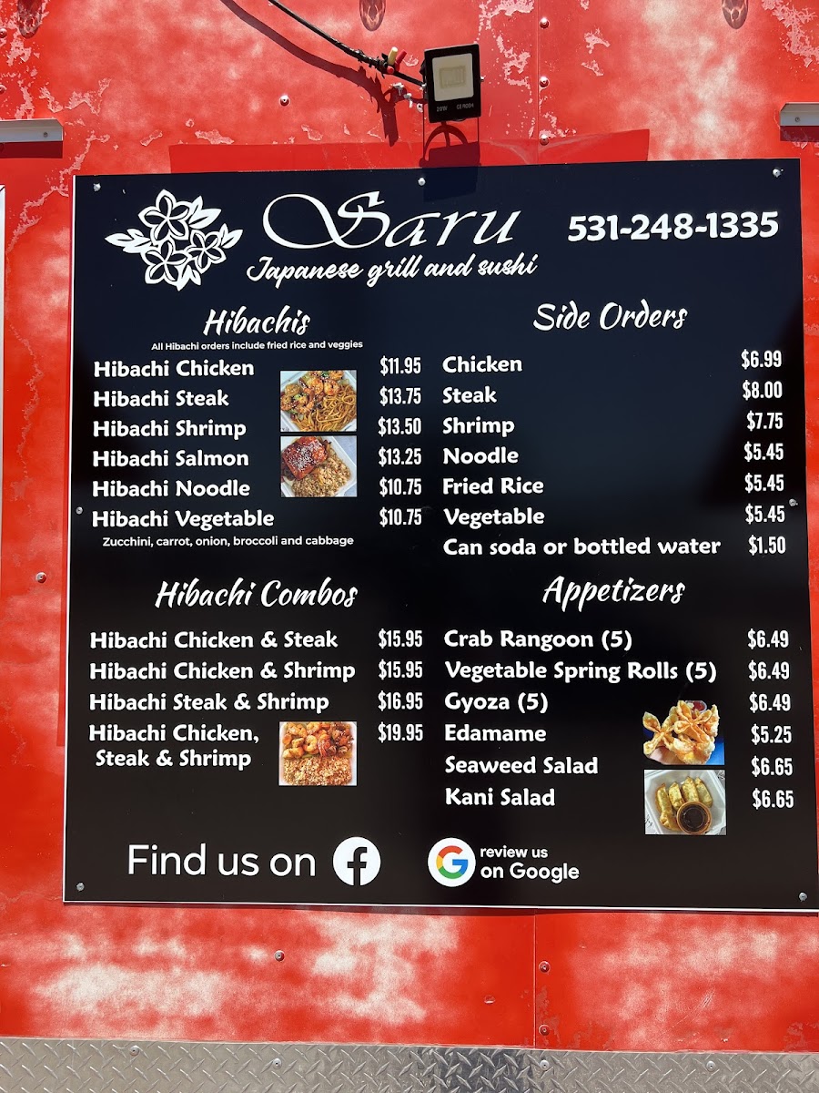 The Saru Hibachi And Sushi Menu offers a delightful mix of Japanese hibachi and sushi options, perfect for anyone craving flavorful and satisfying meals. The hibachi section is particularly popular, with a variety of dishes that cater to different tastes. You can choose from Hibachi Chicken, Hibachi Vegetable, Hibachi Shrimp, Hibachi Salmon, or even Hibachi Noodles for a lighter, noodle-based option. Each hibachi dish is grilled to perfection and served with a side of rice, making for a hearty and delicious meal.