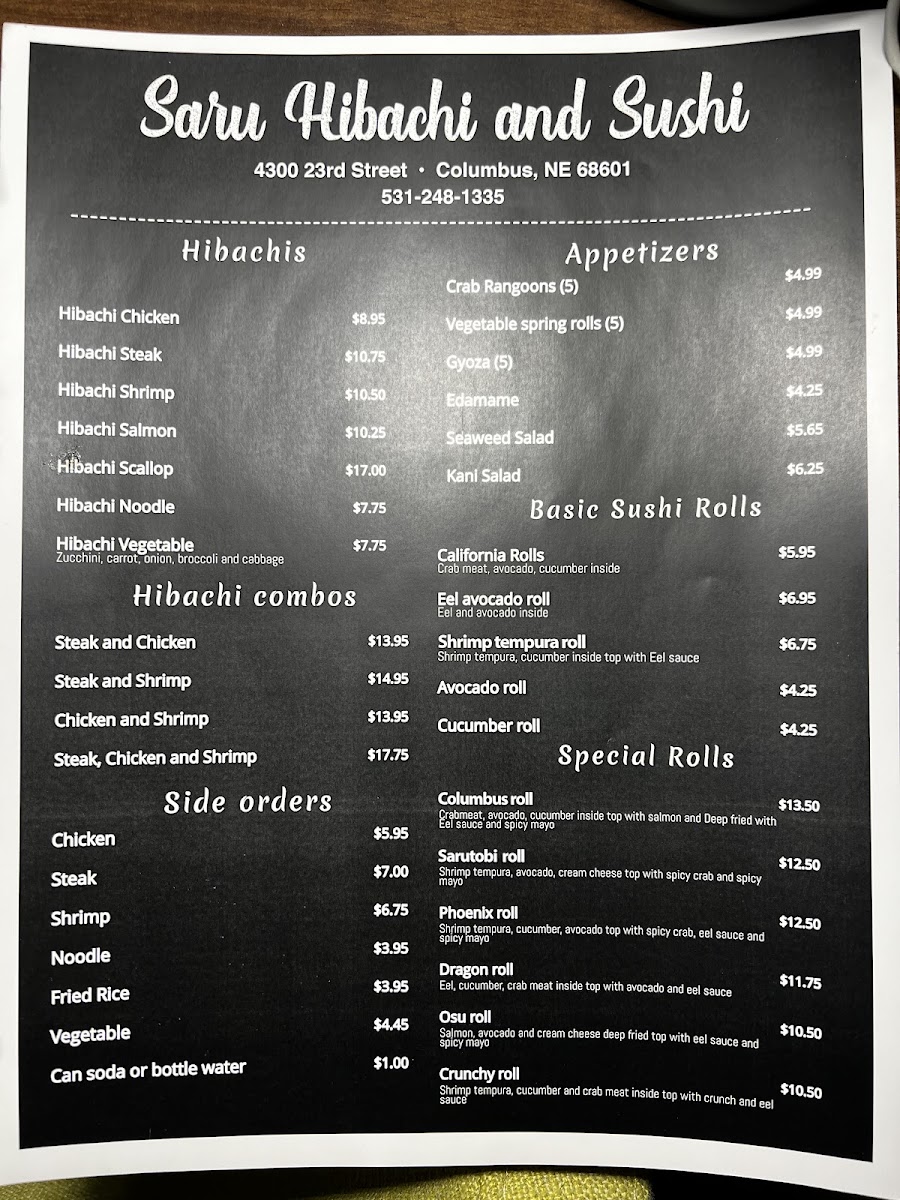 Overall, the Saru Hibachi And Sushi Menu provides a diverse selection of dishes that are both flavorful and visually appealing. Whether you’re in the mood for a savory hibachi dish or an intricate sushi roll, the menu has something for everyone. With both traditional and innovative options, it’s clear that Saru Hibachi and Sushi is committed to delivering high-quality meals that will satisfy every craving. Whether you’re a hibachi fan or a sushi enthusiast, this restaurant promises a satisfying dining experience with plenty of variety to keep things exciting.